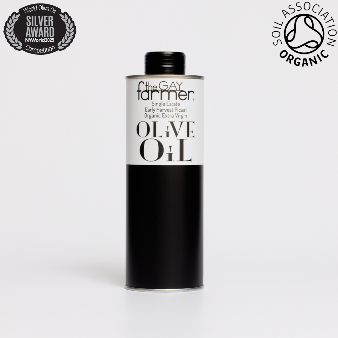 The Gay Farmer Early Harvest Picual October 2024 Organic Extra Virgin Olive Oil 500ml / Free GB mainland delivery with 2 cans or more.
