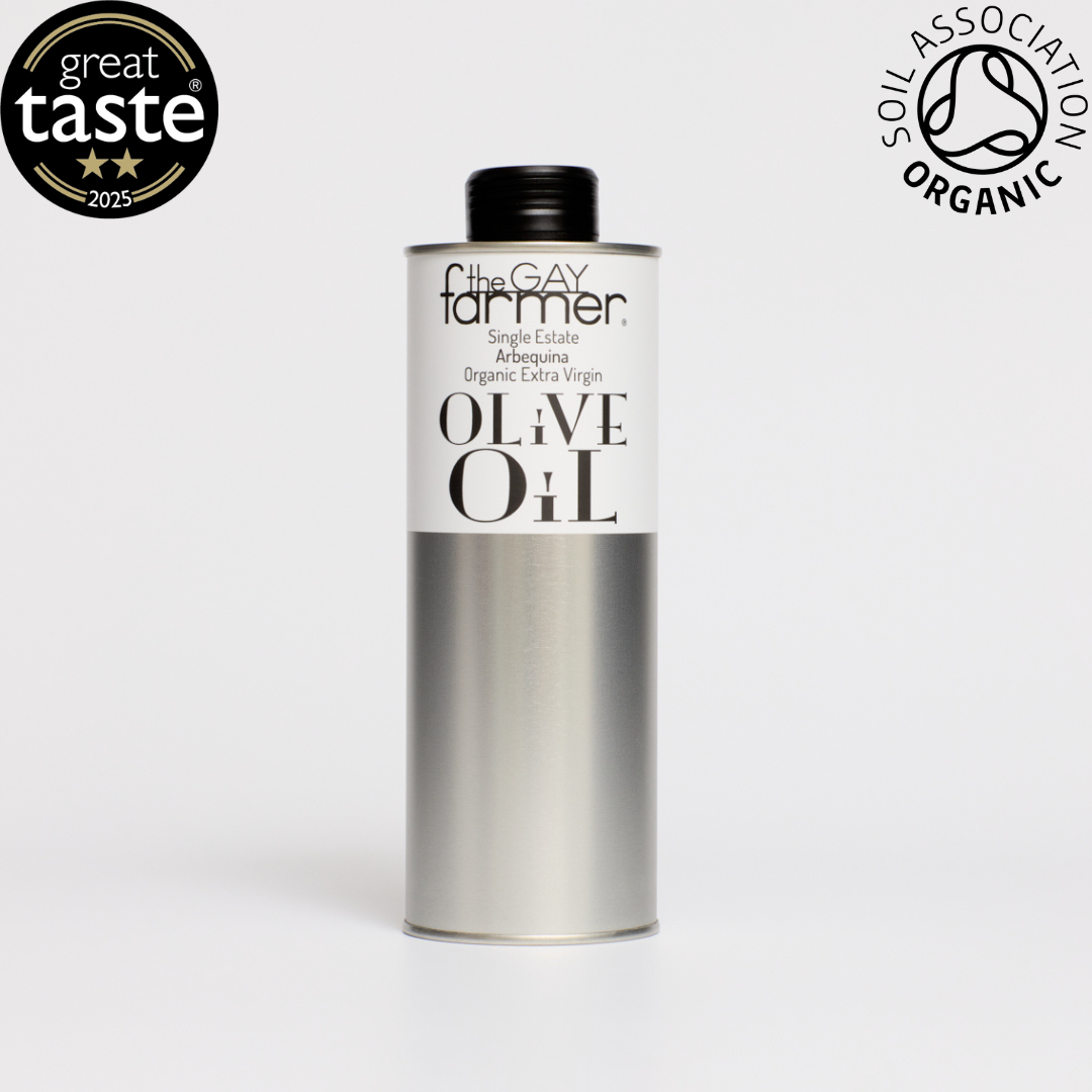 The Gay Farmer Arbequina Organic Extra Virgin Olive Oil November 2024 Harvest 500 ml / Free GB mainland delivery with 2 Cans or more.